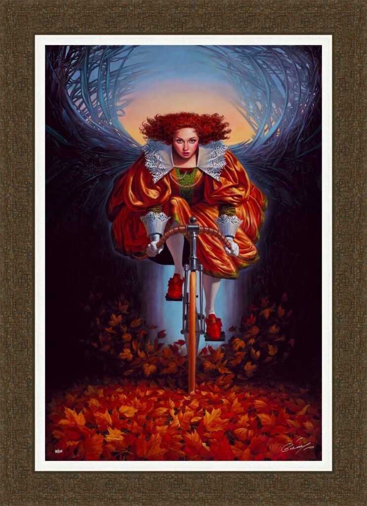 - Key Elements: Red-haired muse on bicycle, copper Renaissance gown, tunnel of blue “wing” branches, autumn leaves